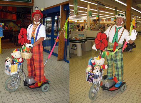 Monsieur Boul le clown jonglerie magie spectacle clownesque déambulatoire matériel ludique, trottinette, bicyclette pouêt pouêt, déambulateur électrique, costumes très variés suivant occasion.
